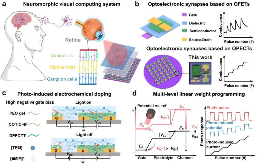 光电突触器件在推动类脑人工智能和类视觉系统发展中发挥着关键作用。近年来,基于有机场效应晶体管的光电突触器件备受关注,但也面临多方面的挑战,例如其编程非线性度大、存储状态有限、响应波长范围受限(通常局限于紫外或可见光波段)。此外由于有机半导体薄膜与传统光刻制备技术的不兼容,导致有机光电突触晶体管的晶圆级阵列化制备也是领域难题。
